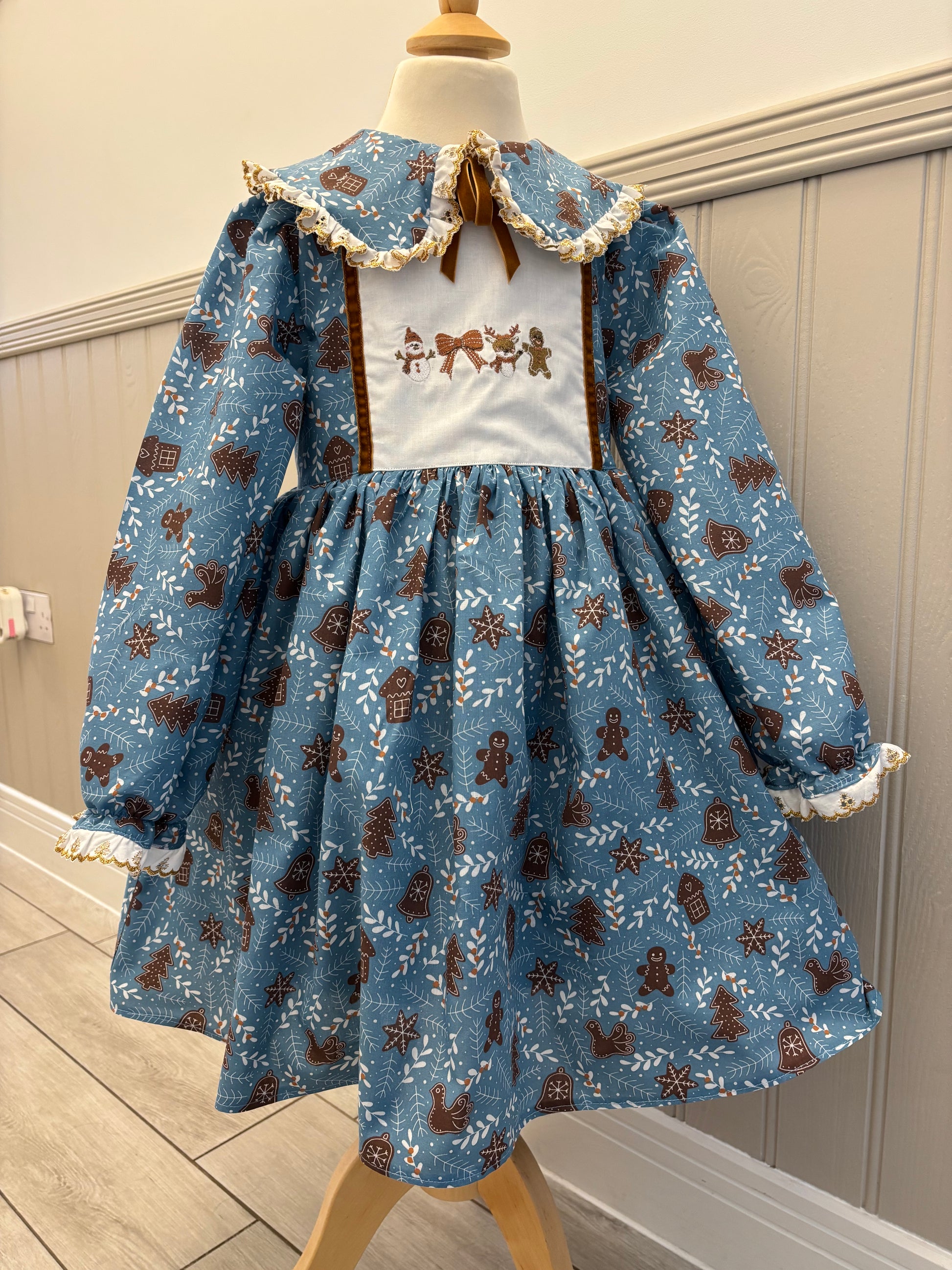 A classic BIRDIE style dress featuring a beautiful machine embroidered panel, gold broderie collar and cuffs and an extra skirt lining layer to keep your little one warm.