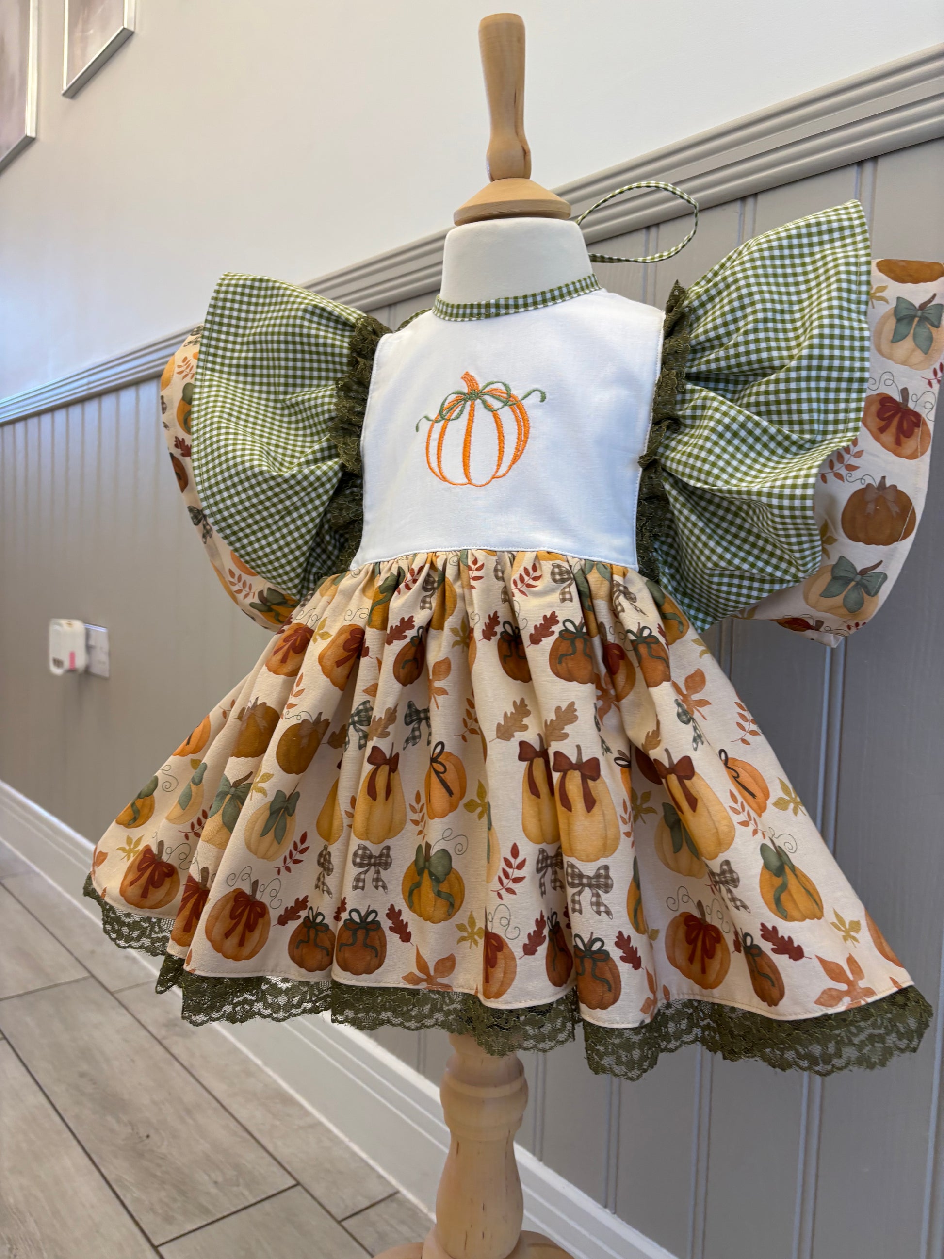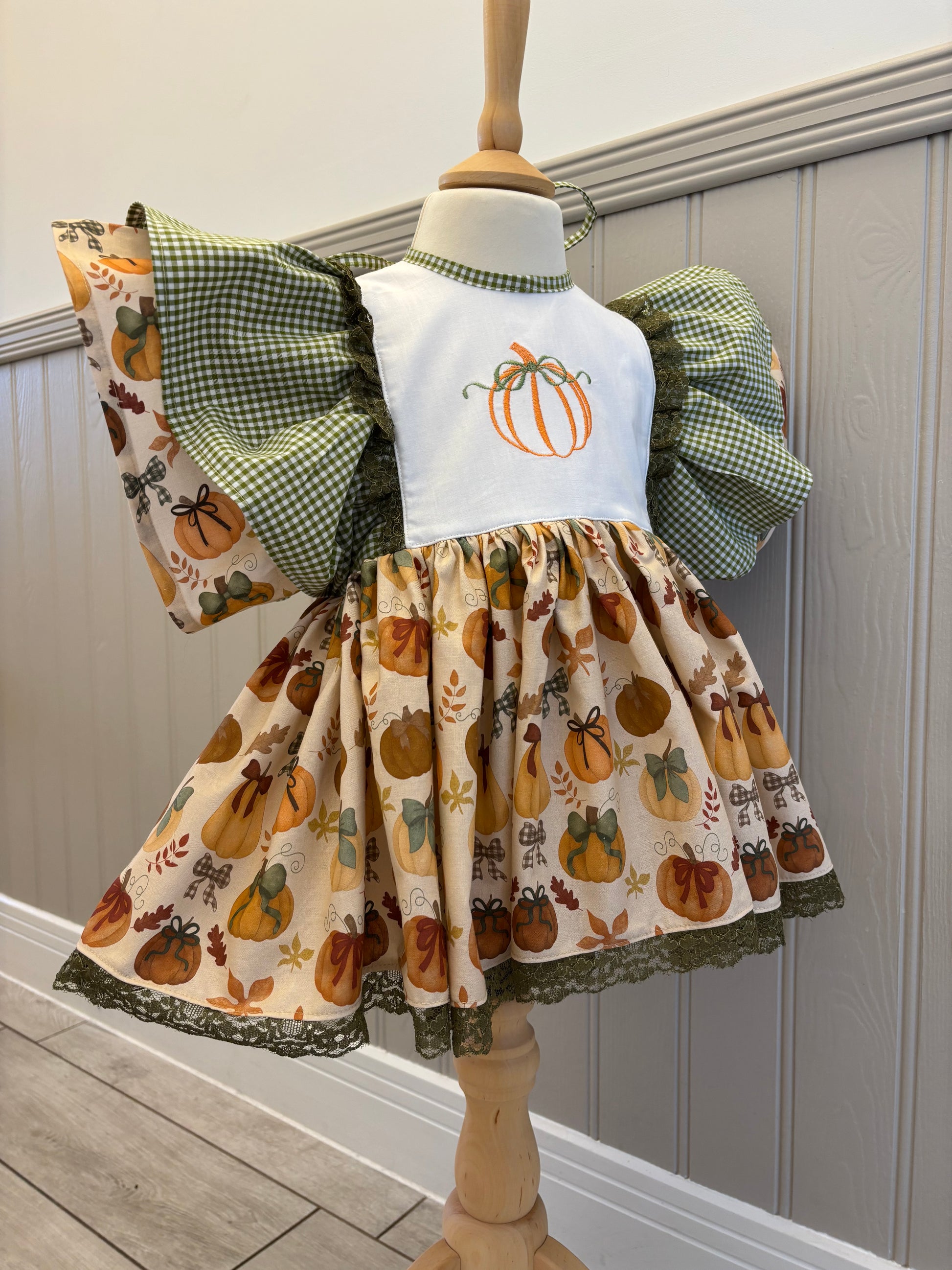 A pumpkin patch essential! This maude design is spacious (please see measurements below). It features a tie gingham neck, machine embroidered pumpkin panel front and comes complete with bloomers.