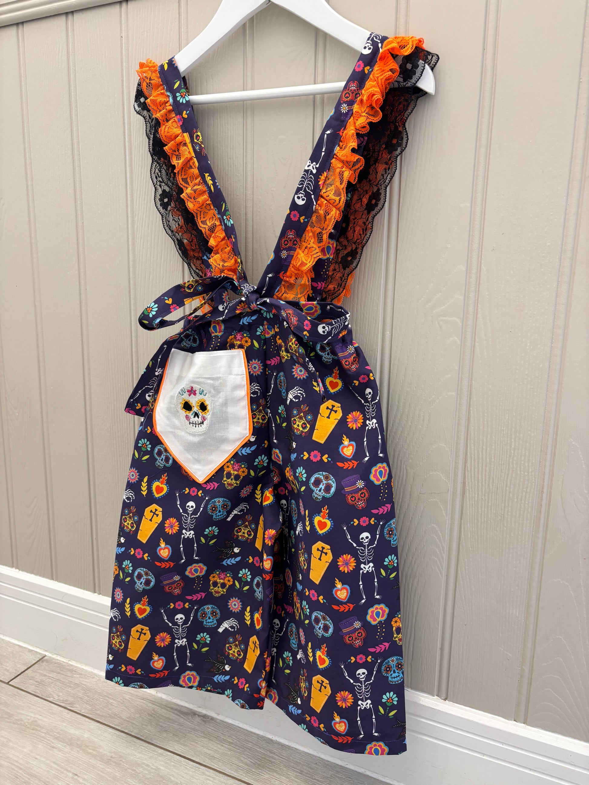 This pair of trousers has removable straps with double lace flutters. The back of the trousers features a gorgeous sugar skull, machine embroidered pocket.